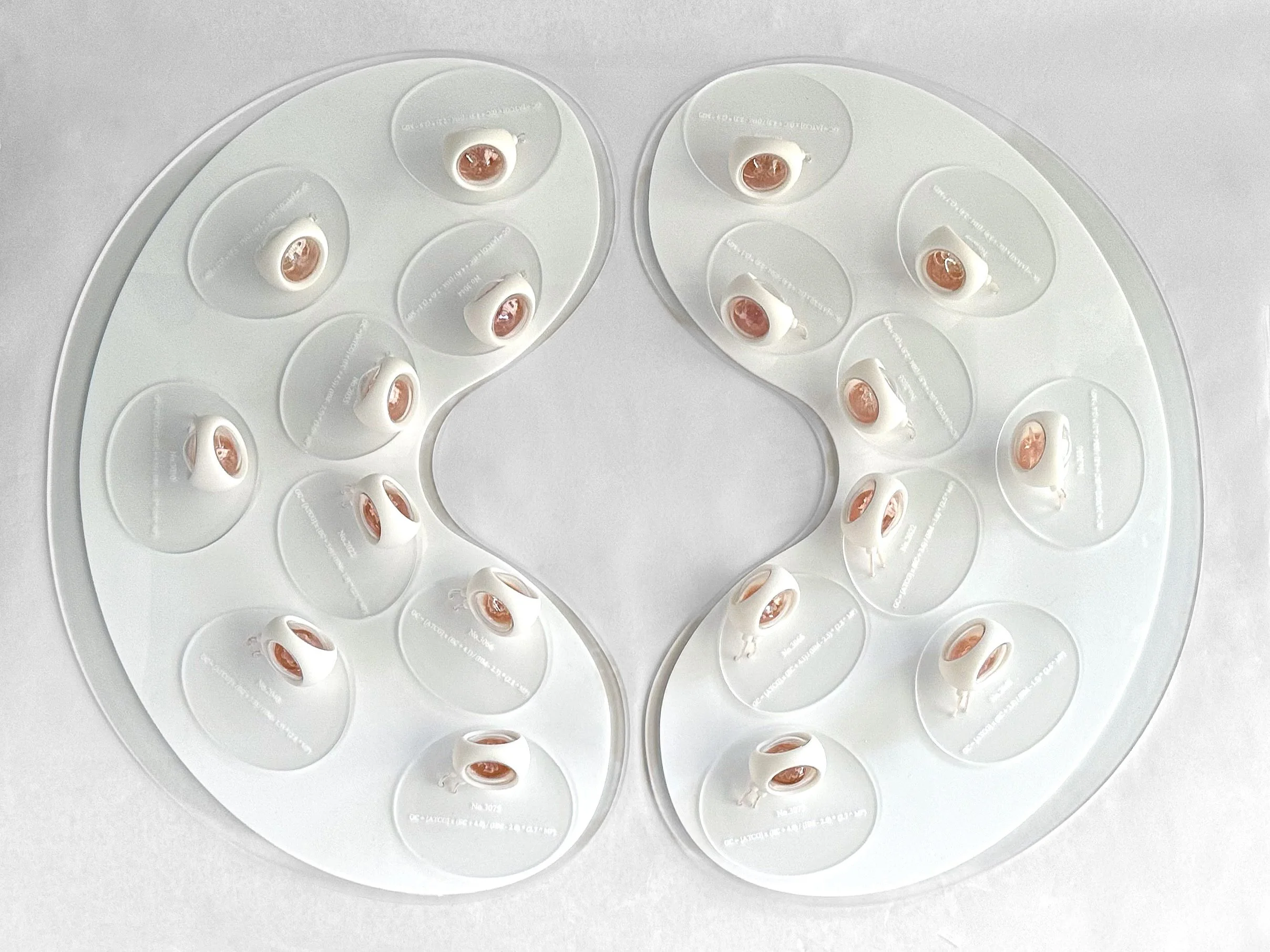 Each seed's physical body is meticulously crafted through advanced 3D printing technology. Drawing parallels with contemporary medical advancements, 3D printing serves not only as a method for creating transplant organs but also as a method by which artificial processes give rise to new life forms. In this envisioned future, advanced bioengineering techniques allow for the artificial editing and mass production of plants designed as tools and devices for human use. The incubators, inspired by eggs, symbolize the inception of life, serving as protective shelters for the seeds. Repetition and units establish a cohesive base that reveals the origin of the plants, grown from lab-generated data formulas, prompting contemplation on the ethical implications of blurring the lines between the artificial and the natural. The design of these incubators is crafted to evoke an emotional connection that fosters empathy towards living entities affected by our technological interventions. Such empathy leads to a deeper consideration of the plants' needs, emotions, and their significance as living organisms, potentially increasing awareness and appreciation for nature. This contemplative state encourages individuals to reflect on their sense of responsibility towards these technologies.